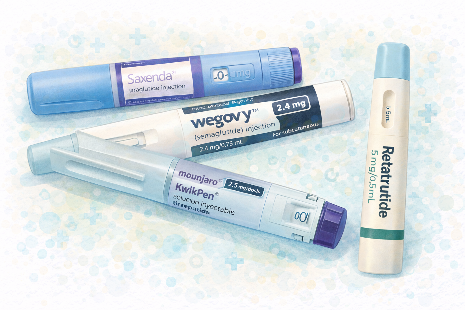 Los "Super-Inyectables" de nueva generación: incluyen desde agonistas de GLP-1 como Ozempic y Wegovy, hasta multi-agonistas más avanzados como tirzepatida, mientras que otros, como Retatrutida (conocida como "Triple G") y CagriSema, siguen en investigación.